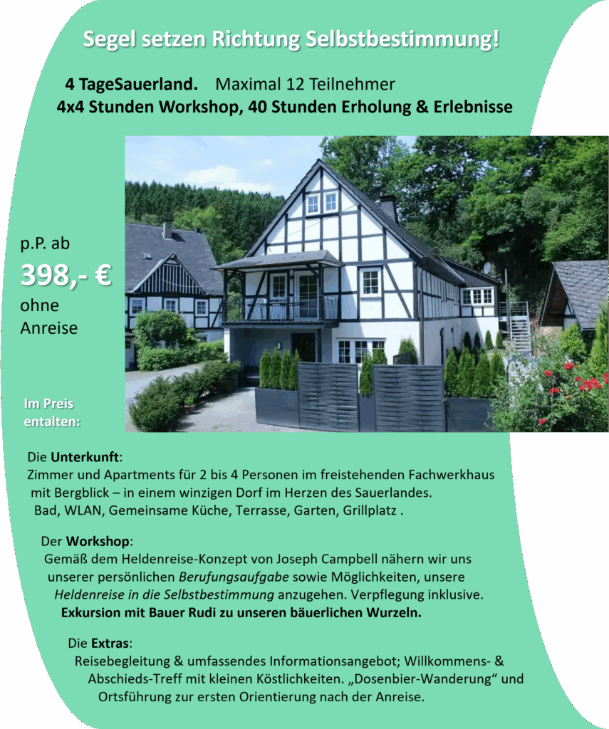 Orientiert am Konzept der „Heldenreise“ von Joseph Campbell kümmern wir uns um Körper, Geist und Seele. Und nähern uns unserer persönlichen Berufungsaufgabe sowie Möglichkeiten, die damit beginnende Heldenreise in die Selbstbestimmung anzugehen.