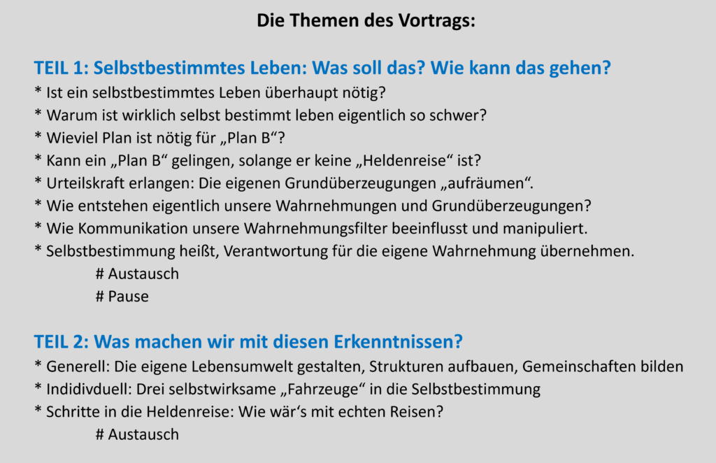 Diese provokante These ist Ausgangspunkt eines Vortrages, der als eine herausfordernde Reise für das Publikum konzipiert ist. Er will bewußt Redebedarf erzeugen, daher gehört die Publikumsdiskussion elementar dazu.