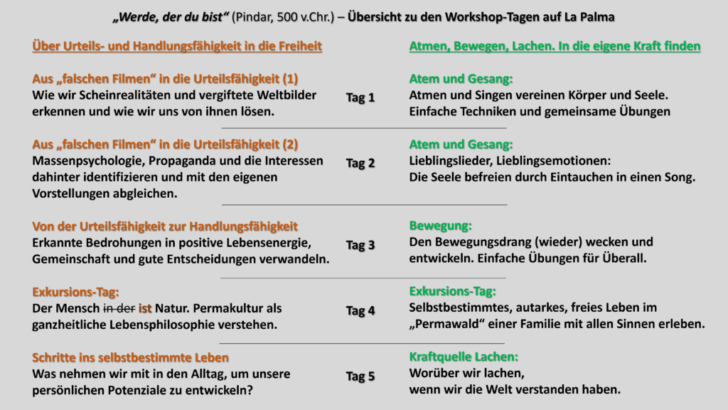 Die nächste Workshop-Reise findet statt vom 14. bis 28. März 2026 auf der kanarischen Insel La Palma. 5 Tage Workshop und 8 Tage Erholung und Erlebnisse warten auf die Gäste. Unten eine Übersicht über die Themen der Workshop-Tage. Weitere Infos und Buchung HIER